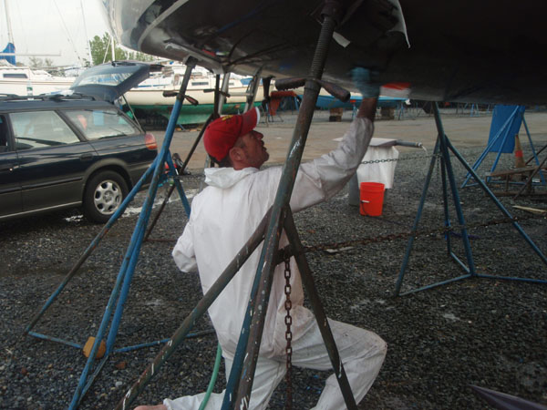 Thanks to a last-minute change in schedule, I had time to go up to the boat last night with Duncan and Brian. We found she had been moved from the end of the yard to a spot very close to the painting shed, and the imperfections on the bottom had fresh filler applied. These are good signs that the bottom prep is moving along, which is extremely important considering the first race will be in just over two weeks!