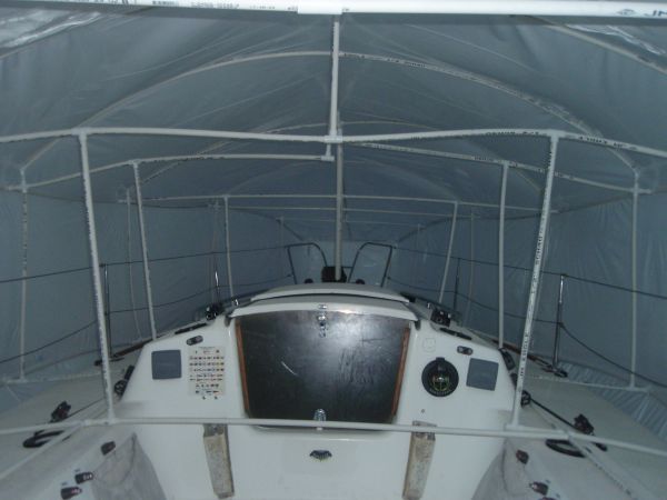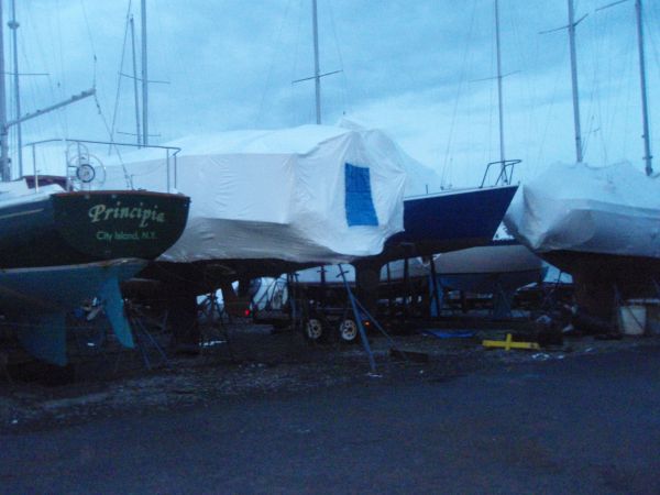 Astute readers will have noticed a small gap between the previous posting and this one. Although I'm not quite ready to write out the details of the remainder of the season, I would be remiss in not sharing the current state of affairs. Thin Man is on dry land for the winter and as of last week is covered from stem to stern in shrink-wrap plastic so that I can work on deck hardware and wet spots in the deck over the winter.