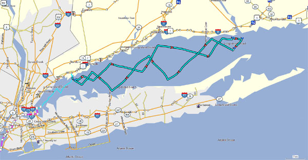 This year's Vineyard race tracking system (Kattack) is so much better than the previous tracker, with nearly real time and frequent updates of position. One suggestion to improve the product would be to make it waterproof. :-D The unit is strapped to the stern pulpit, which on a J/92 just happpens to become fully submerged during high-wind spinnaker knock-downs! As a result, the tracking stopped about a third of the way up the return leg. For those curious what route we took, the track from the GPS I carry around my neck looks like this: